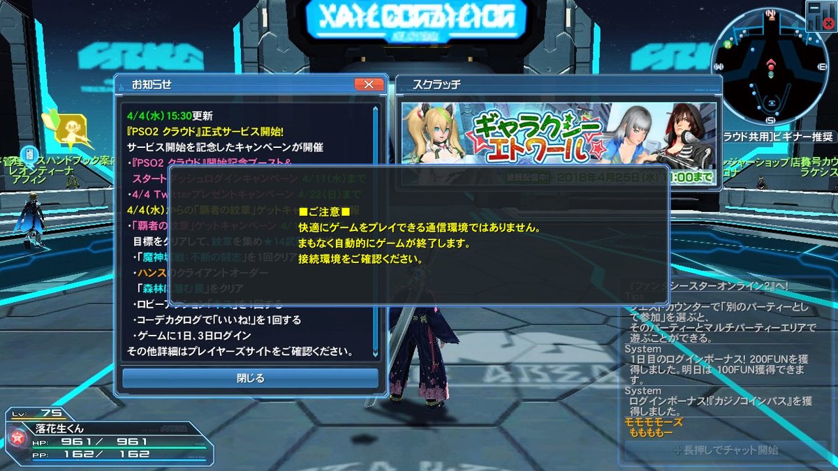更に、PSO2のメインコンテンツである緊急クエストは受注中にクライアントが落ちた場合、時間内の再受注が不可