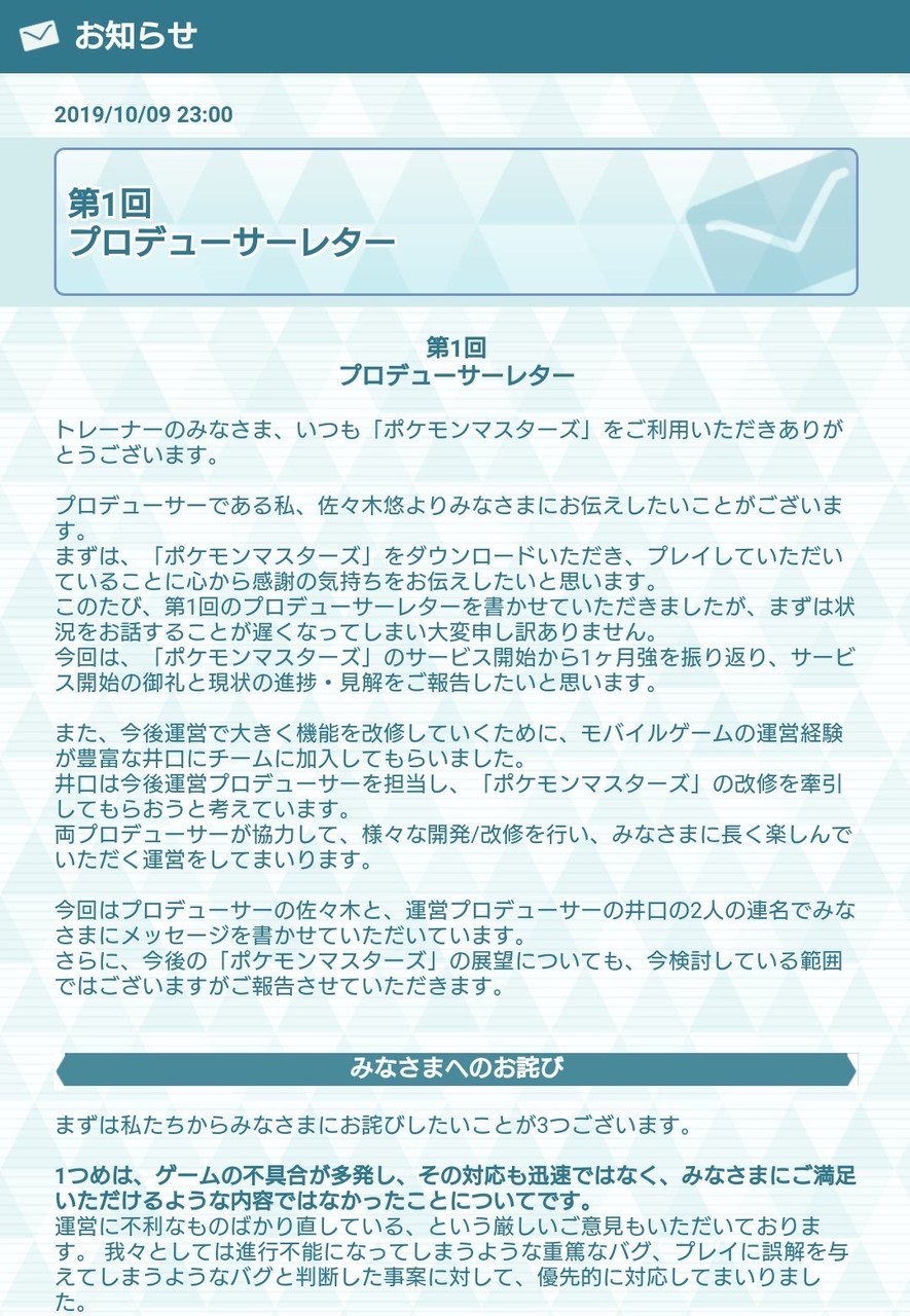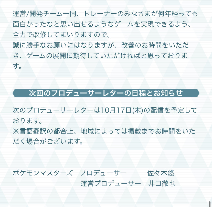プロデューサーレター第二回でまた謝罪し来年3月にポケマスを完成させる宣言をする