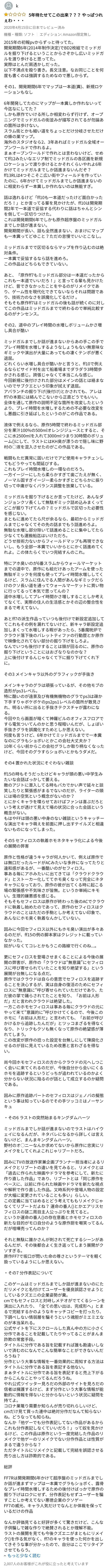 原作改変だからある程度ファン裏切るのはやむなしだが、セフィロスクラウドの距離感が腐女子ウケ狙って臭いのが最悪