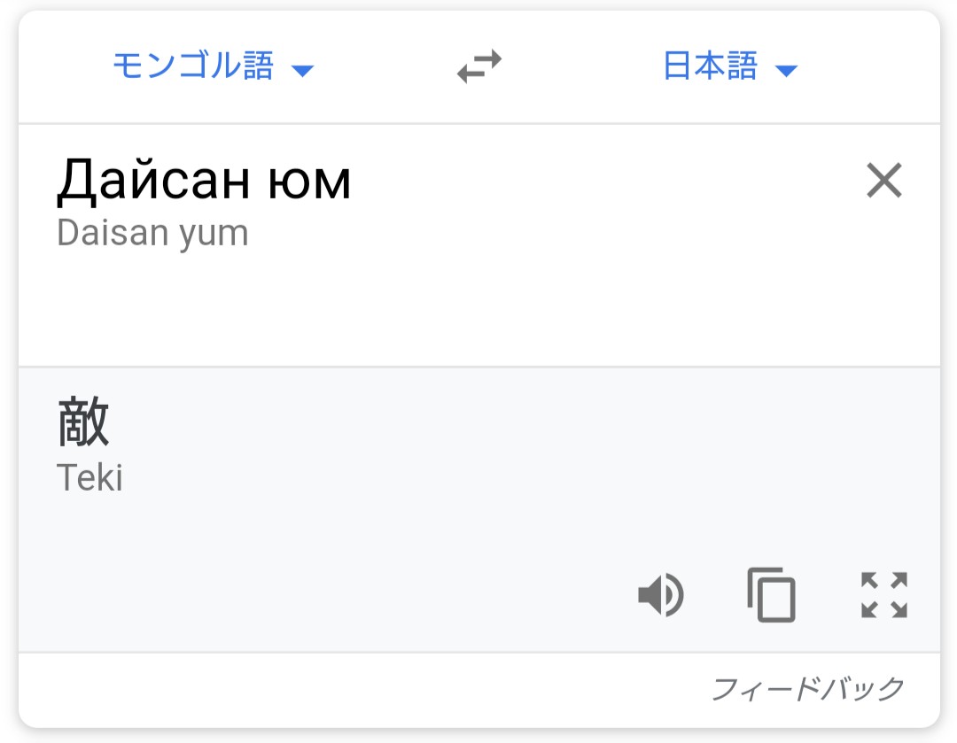ちなみにうえで言ってる“敵だ“の意味の"дайсан юм“は読み方は ダイサン ユム であり、ちょっとこじ付け感が半端ない感じだな。