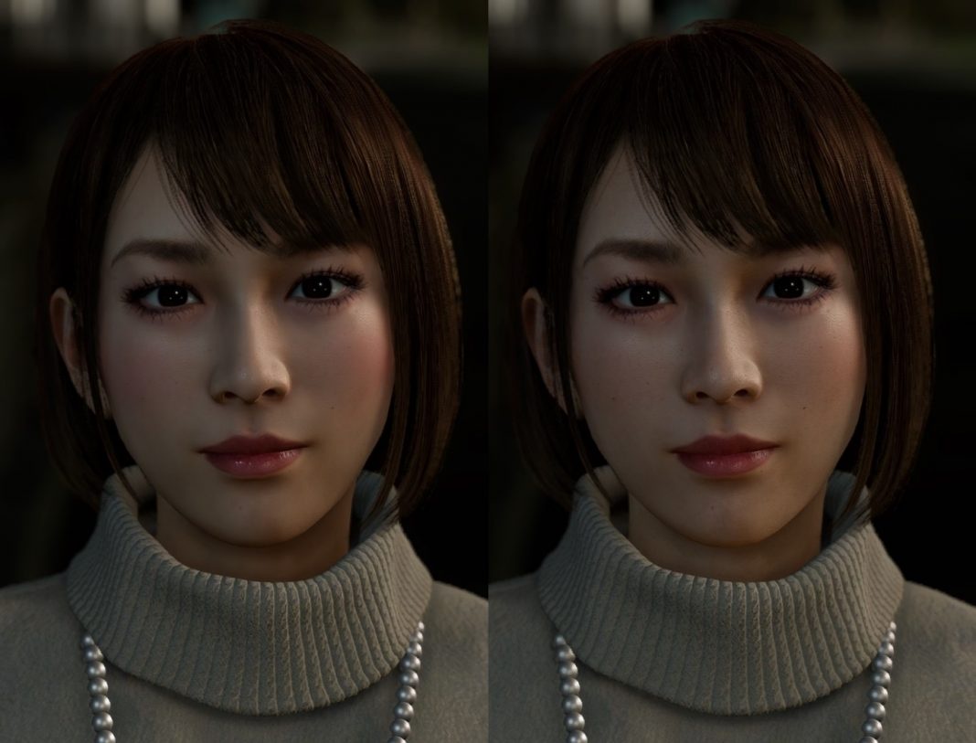 比較画像。左が『龍が如く7』の紗栄子で、右が『龍が如く8』の紗栄子(7のシーンに8のモデルを置いてもらった)。一見すると同じだが、拡大してみると、右の方がリアルな肌質になっているがわかる